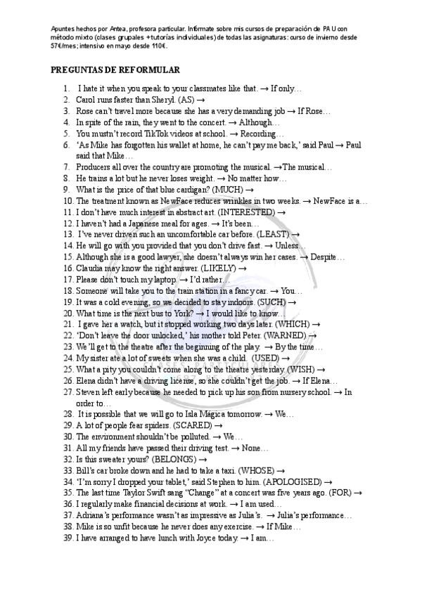 Ejercicios de rephrasing del segundo trimestre para practicar para la PAU. Resueltos y corregidos por la profesora.