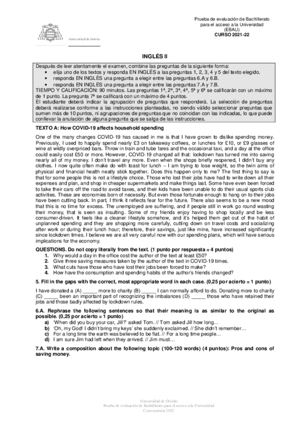 Exámenes y Exámenes Resueltos Inglés EBAU Asturias 2022