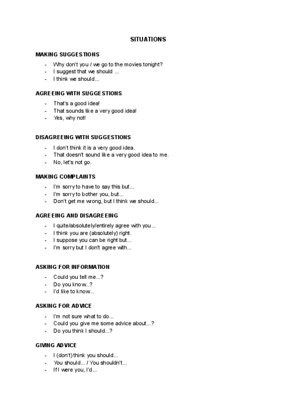Situations inglés. Frases introductorias para comenzar frases en inglés. Making suggestions, complaints, information, advice, invitations, offering help, apologizing, opinions, criticizing