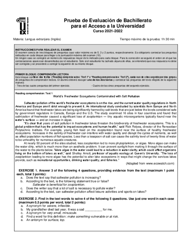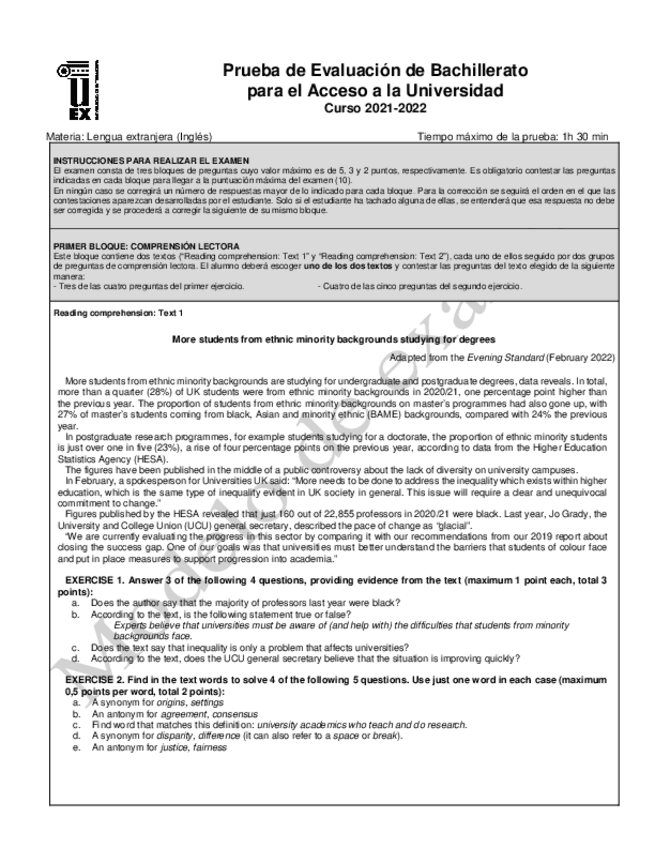 Exámenes Inglés EBAU Extremadura 2022