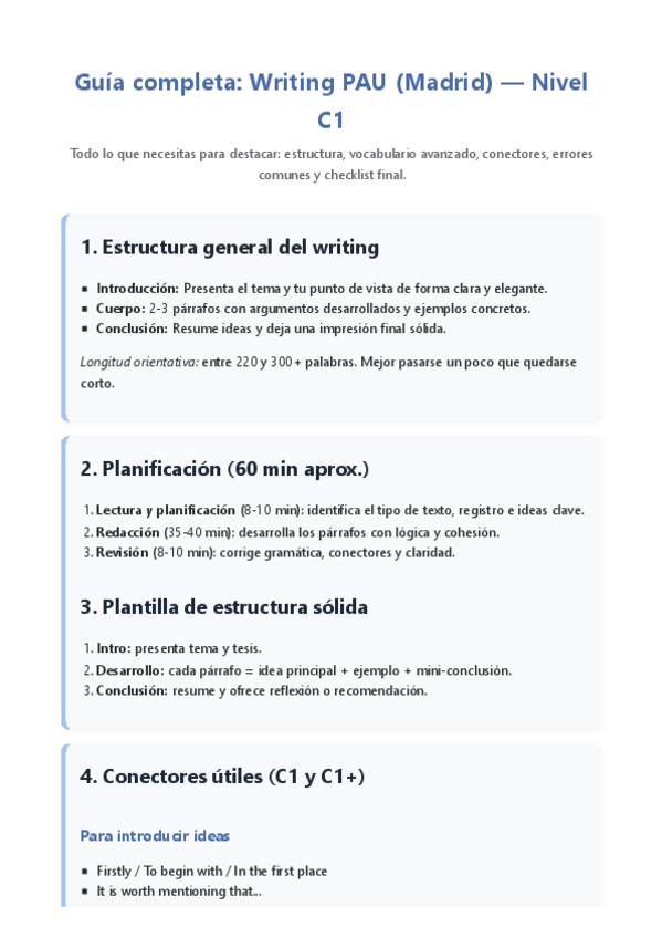 Guía visual con consejos y conectores para destacar en el writing de la PAU de inglés. Enfoque práctico para lograr un nivel C1.