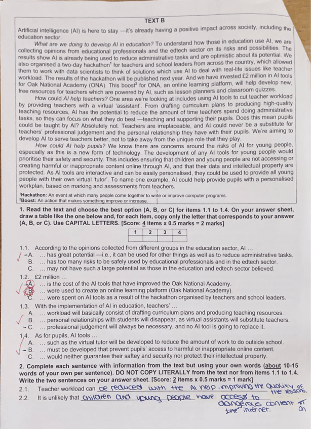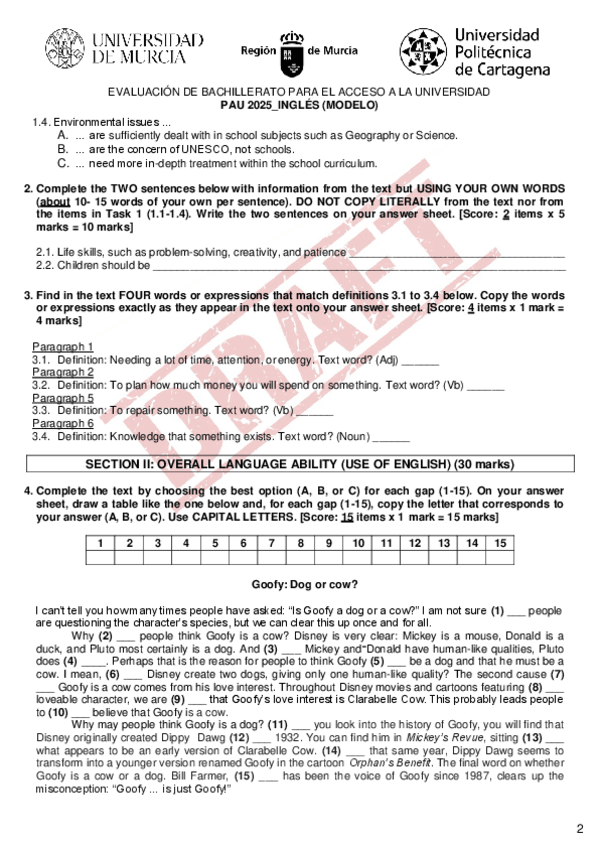 Modelo provisional del examen de inglés para la PAU, 2025.