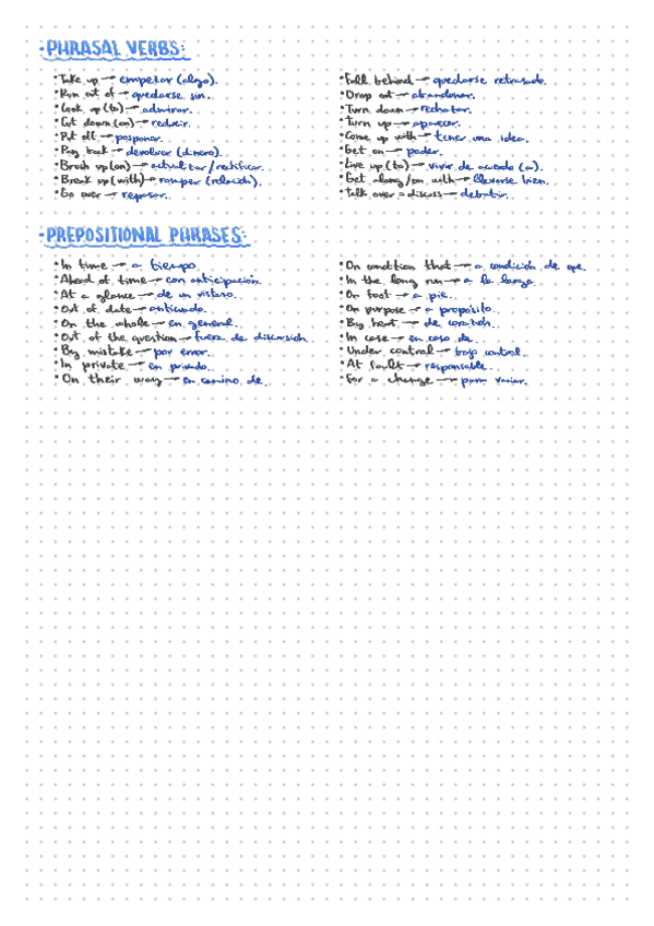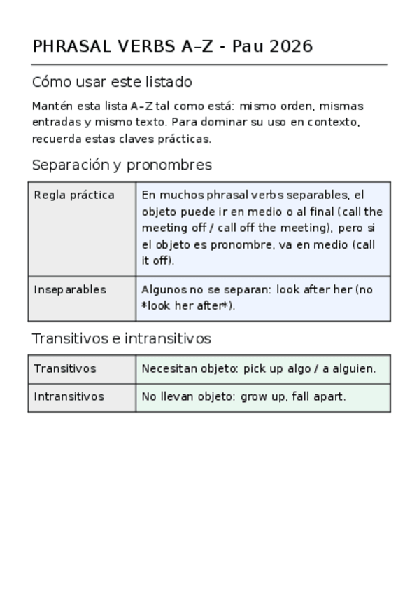 Guía compacta para la PAU 2026: lista A–Z de phrasal verbs con significado claro. Incluye tarjetas de uso (separables vs. inseparables y pronombres; transitivos/intransitivos; sentido de partículas: up/out/off/over), consejos de examen y mini-test con sol