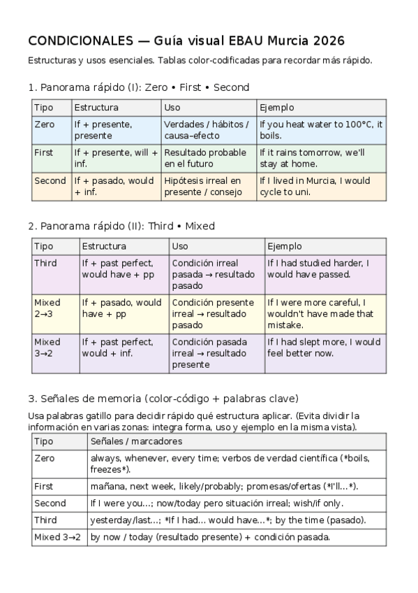 Condicionales para EBAU Murcia: Zero, First, Second, Third y Mixed (2→3 / 3→2) con estructura, usos y ejemplos canónicos. Incluye conectores frecuentes (unless, as long as, provided, in case), reglas de puntuación y inversión formal (Had/Should/Were). Min