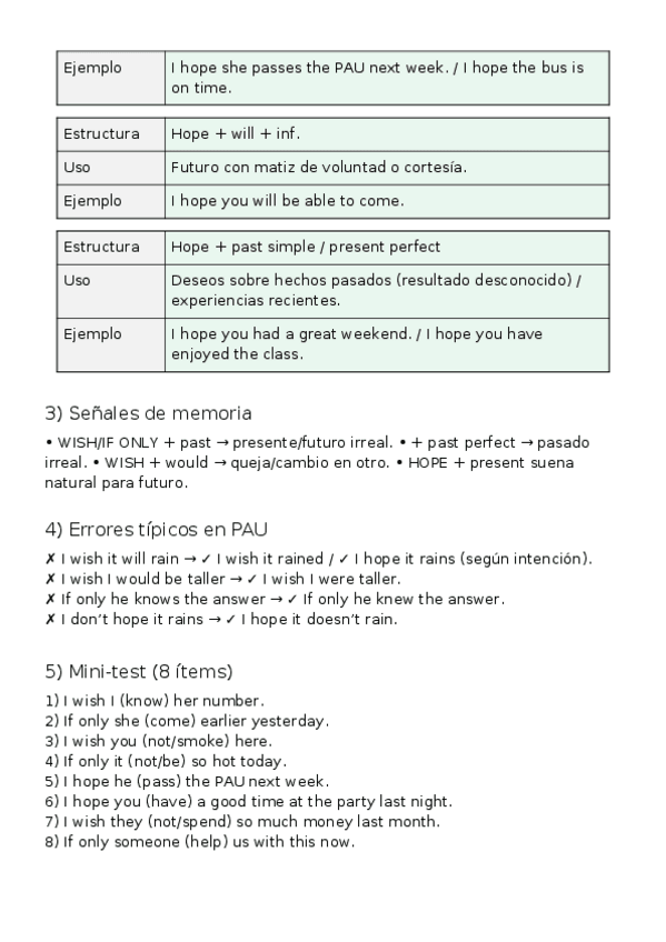 Guía visual para PAU Murcia: uso correcto de WISH / IF ONLY / HOPE con estructuras, usos y ejemplos canónicos. Incluye diferencias clave (wish + past / past perfect / would; if only más enfático; hope con presente para futuro y pasado para hechos ya ocurr