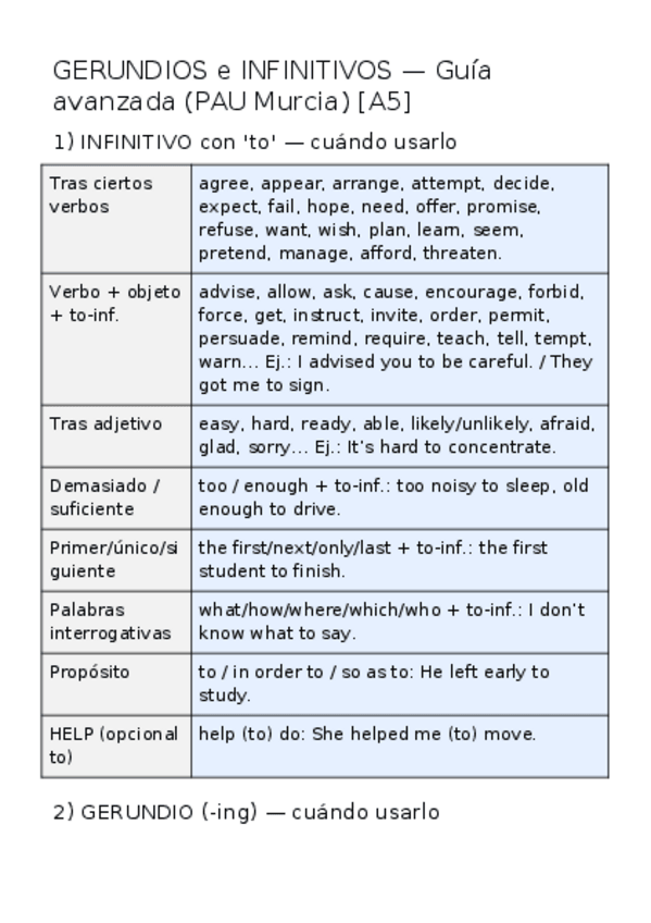 Guía A5 para PAU Murcia sobre gerundios e infinitivos con reglas claras y ejemplos: verbos que van con to-inf. o -ing, patrones con objeto + to, uso tras preposiciones y adjetivos, estructuras de propósito y wh- + to. Incluye verbos que cambian significad