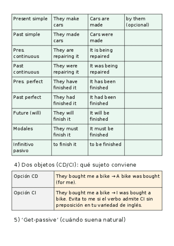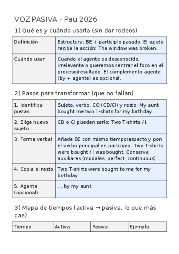 Guía de voz pasiva para Pau 2026 (Murcia): fórmula be + participio, mapa de tiempos (activa→pasiva), doble objeto (CD/CI), get-passive, pasiva con reporting verbs (It is said… / He is said to…), phrasal verbs, interrogativas y negativas, causativa (have/g