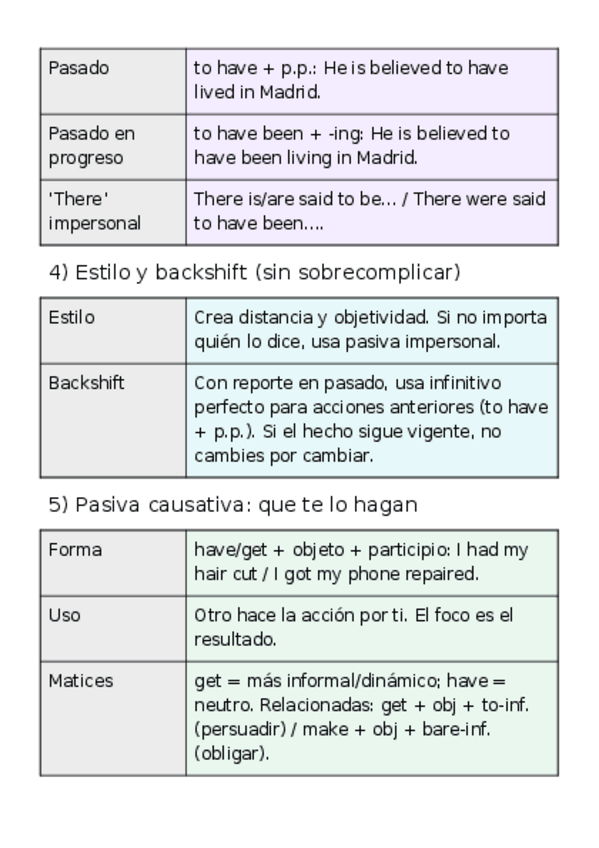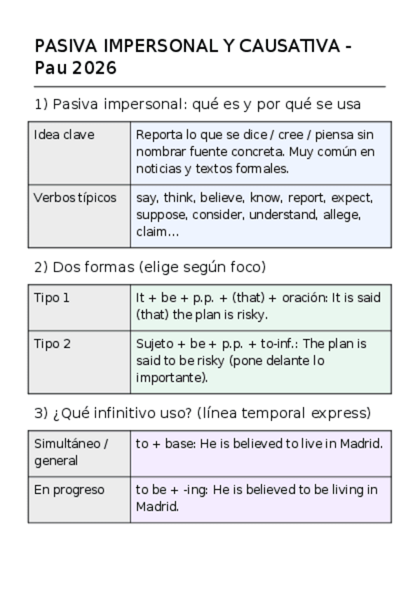 Guía de pasiva impersonal y causativa para Pau 2026 (Murcia): patrones It is said that… / He is said to… con infinitivos (to / to be -ing / to have -ed / to have been -ing) y There is/are said to…; have/get something done (matices, experiencia: had his wa