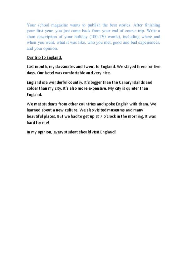 Writing sobre mi experiencia en el hotel en Londres. Nivel a2 de inglés Escuela Oficial de Idiomas (también sirve para 4º de ESO). Ideal para practicar pasado simple y vocabulario sobre la habitación. Está basado en un hecho real. Pienso que doy suficient