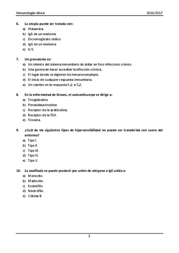 Primer parcial tipo test de Inmunología clínica del curso 2016/2017.