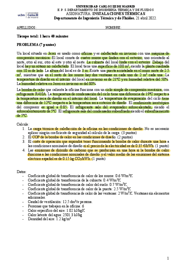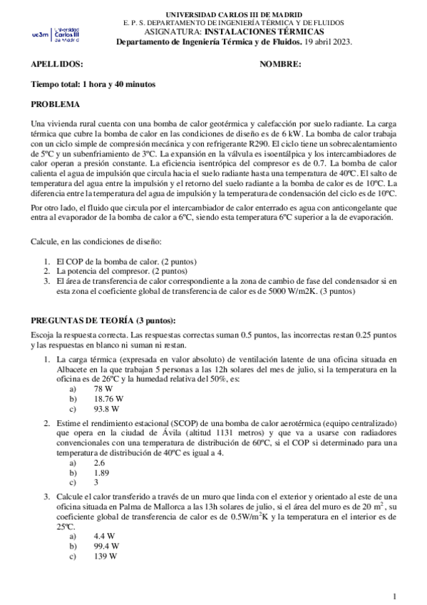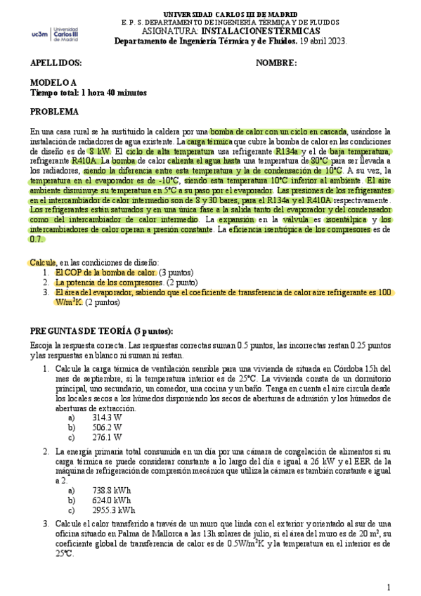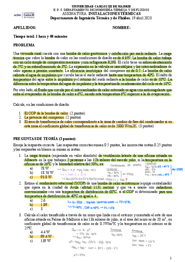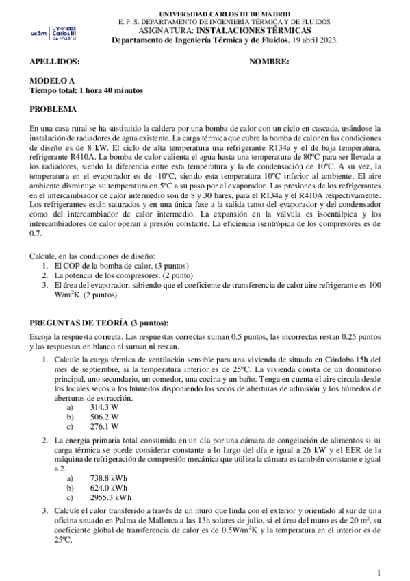 He publicado nuevos examenes de 3º Instalaciones Térmicas: Parcial 2022-2023 A solucion.pdf
