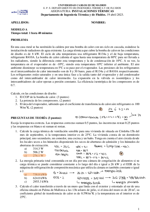 He publicado nuevos examenes de 3º Instalaciones Térmicas: Parcial 2022-2023 A solucion.pdf