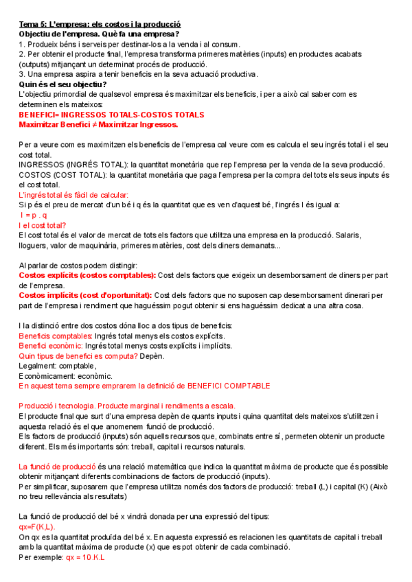 Apunts tema 5 (L’empresa: Els costos i la producció) d'Introducció a l'economia. Any 2024-2025