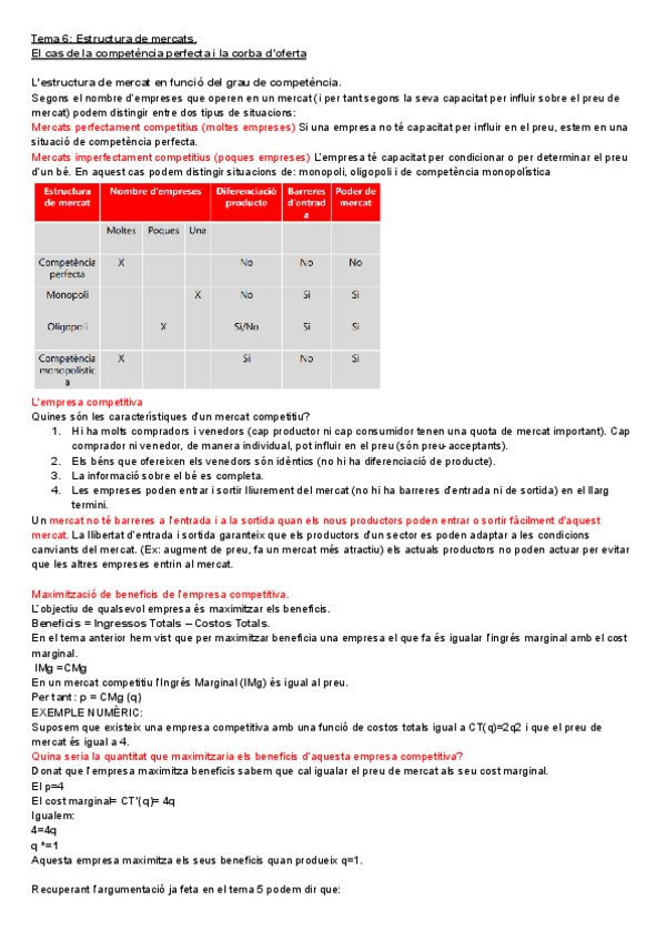 Apunts complets Tema 6. ESTRUCTURA DE MERCATS. EL CAS DE LA COMPETÈNCIA PERFECTA I LA CORBA D’OFERTA. Any 2024-2025