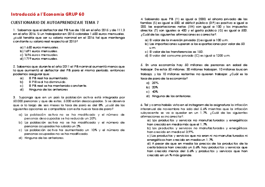 Test tema 7 amb solucions. MACROECONOMÍA: MAGNITUDES AGRADADAS. Any 2024-2025