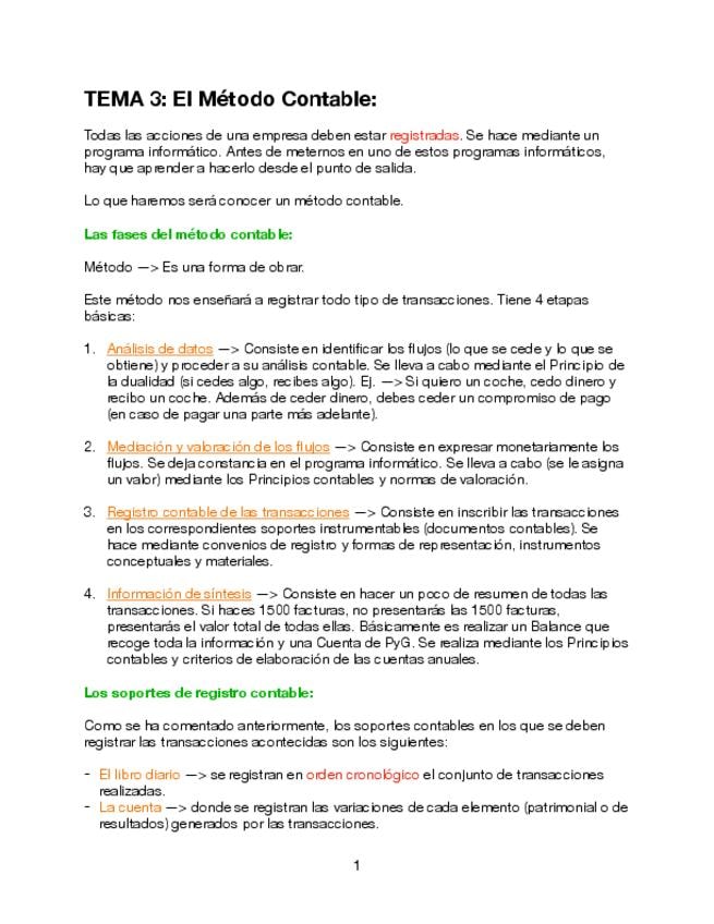 Tema 3 de Introducción a la Contabilidad: El método contable. - Fases del método contable. - Libro Diario. - Cuenta. - Saldo de una cuenta. - Libro Mayor. - Etc.