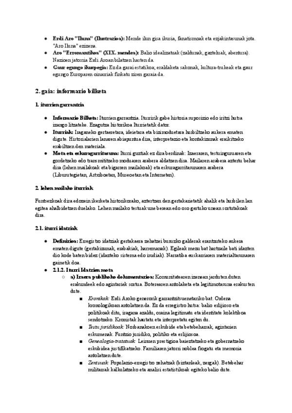Apunte osoak eta ordenatuak irakasgaiaren lehenengo atalari buruzkoak (Gaia 1: Sarrera eta Gaia 2: Informazio Bilketa). Guztiz ordenatuta klaseko eskemaren arabera. Eduki garrantzitsuak: Iturri idatziak (publikoak/pribatuak), arkeologia motak eta korron