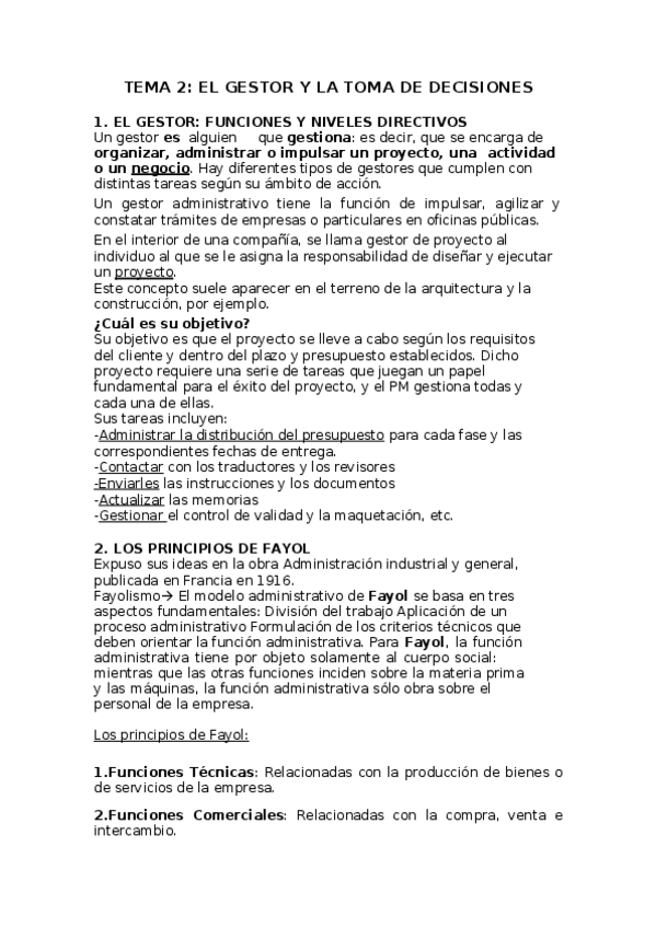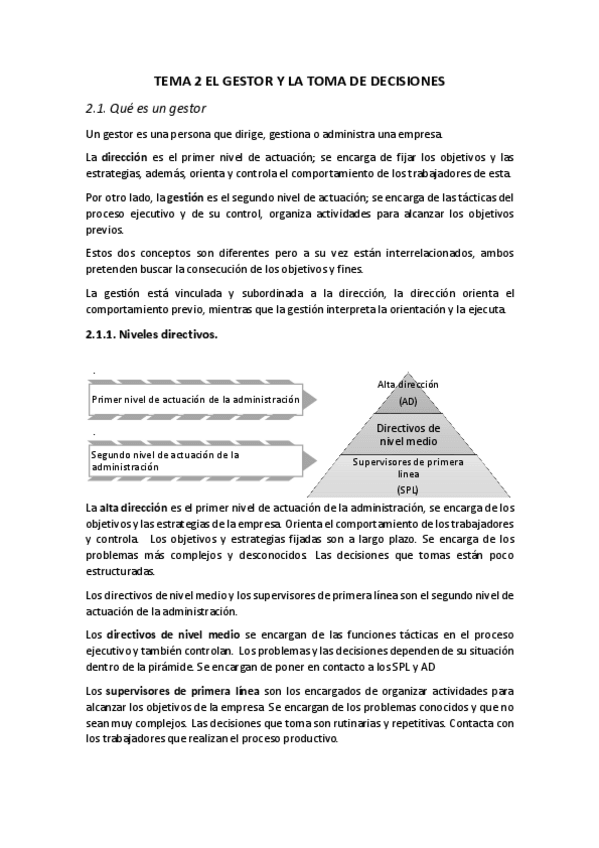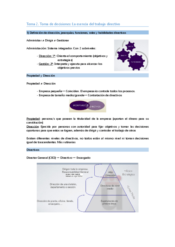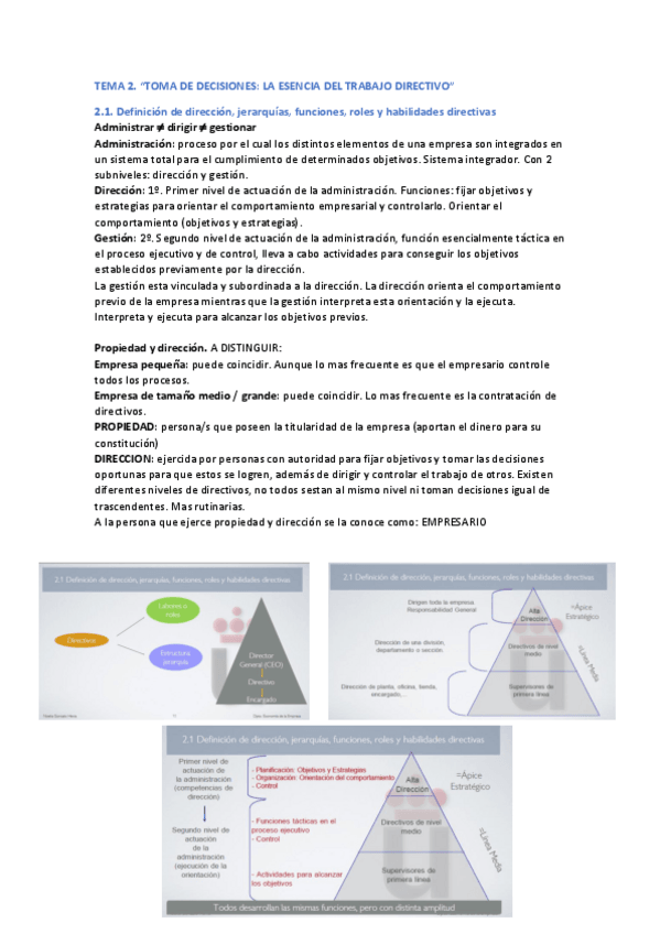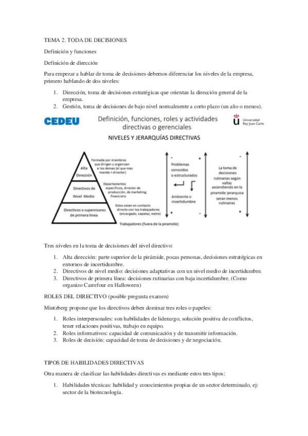 Tema 2: Toma de decisiones: La esencia del trabajo directivo 1. Definición de dirección, jerarquías, funciones, roles y habilidades directivas 2. El proceso de toma de decisiones 3. La toma de decisiones: función principal del directivo 3.1 Forma en la qu