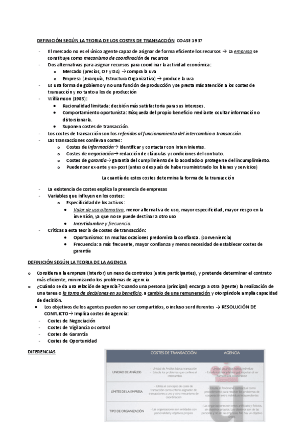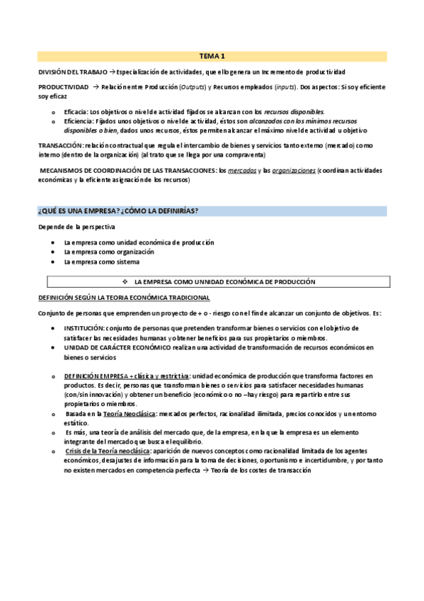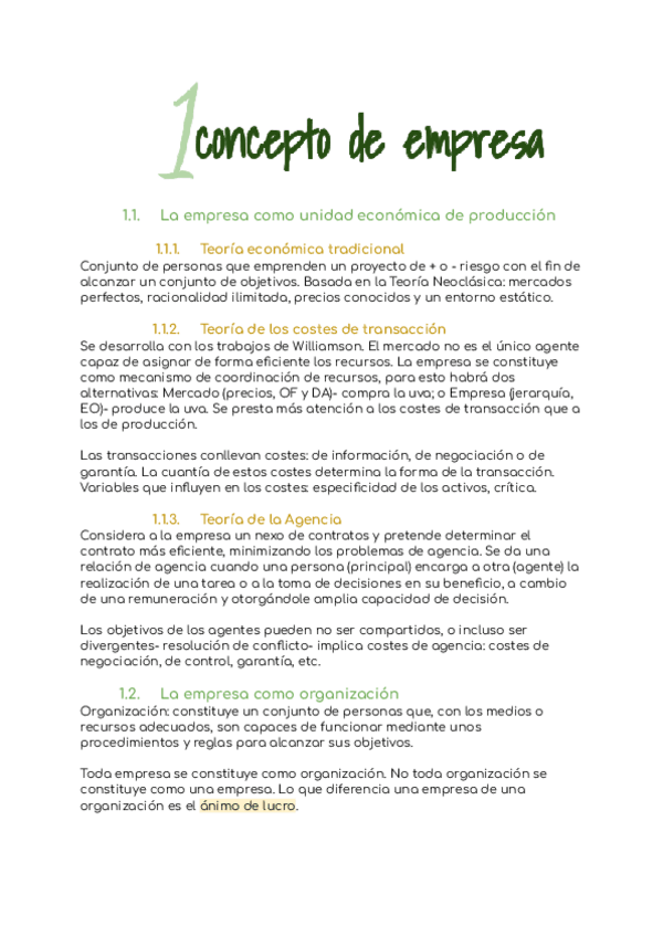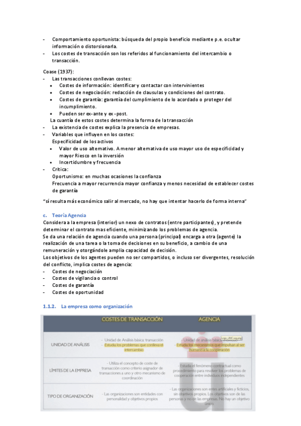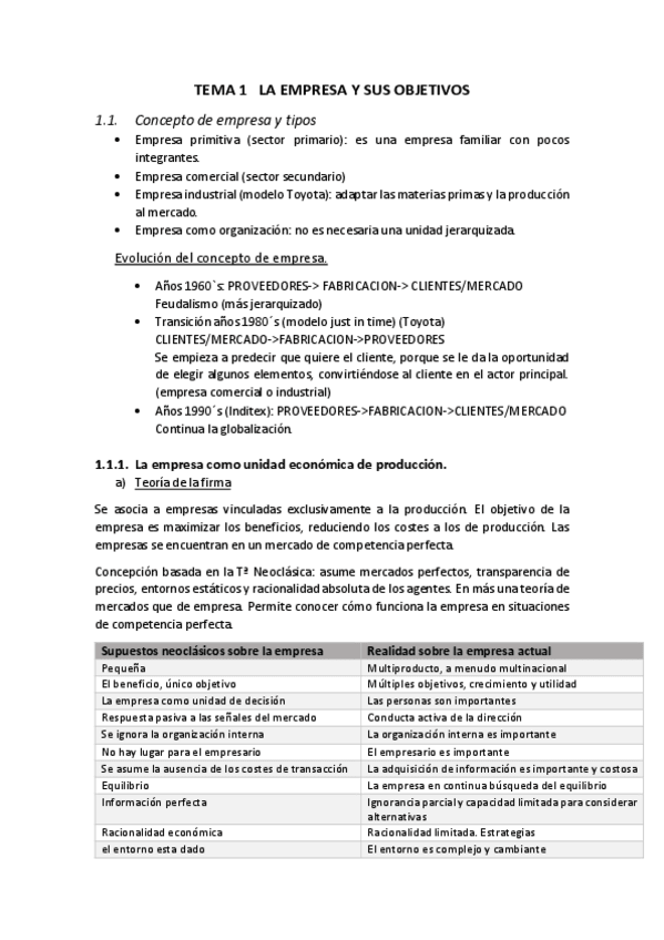 Tema 1: La empresa y sus objetivos 1. Concepto de empresa 1.1. La empresa como unidad económica de producción a) Teoría Económica Tradicional b) Teoría Costes de Transacción c) Teoría Agencia 1.2. La empresa como organización 1.3. La empresa como si