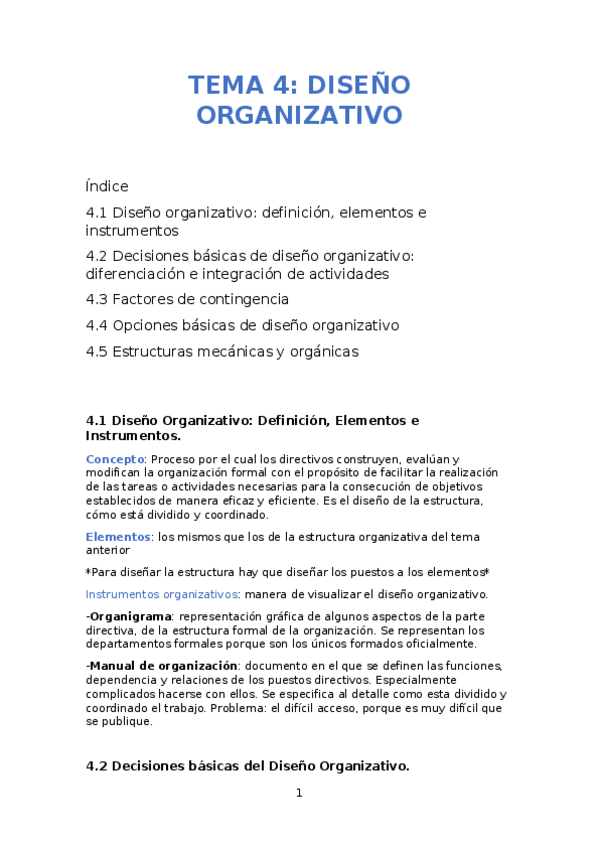Tema 4: Diseño organizativo 1 Diseño Organizativo: Definición, Elementos e Instrumentos 2 Decisiones Básicas de Diseño Organizativo: Diferenciación e Integración de Actividades 3 Factores de Contingencia 4 Opciones Básicas de Diseño Organizativo 5 Estruct