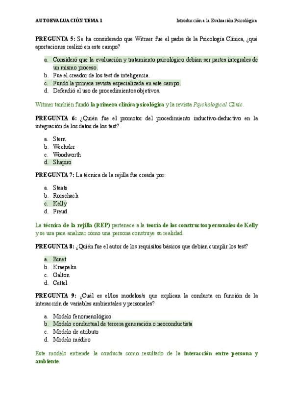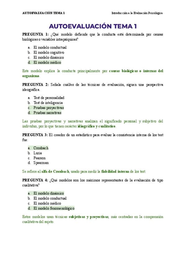 AUTOEVALUACIÓN DEL TEMA 1 DE INTRODUCCIÓN A LA EVALUACIÓN PSICOLÓGICA. TIENE LAS RESPUESTAS CORRECTAS.