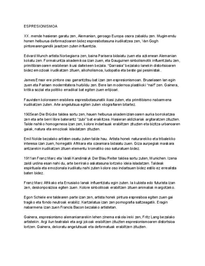 Espresionsimoaren laburpen bat, Die Brucke eta Der Blaue Reiter taldeak lunduta. Aipatzen diren artistak: Edvard Munch, James Ensor, Emil Nolde, Franz Marc eta Egon Schiele.