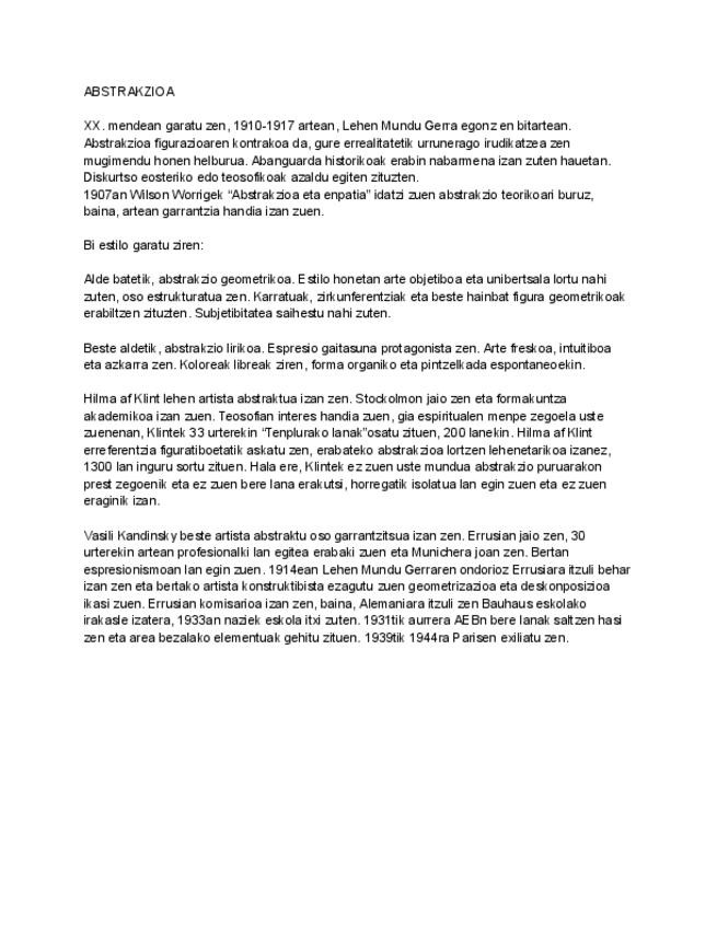 INPRESIONISMOA, POSTINPRESIONISMOA, SINBOLISMOA, KUBISMOA, FUTURISMOA, ESPRESIONISMOA ETA ABSTRAKZIOA