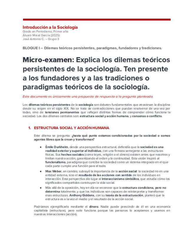 Con esta respuesta deberíamos poder responder a la pregunta planteada en el examen, demostrando que hemos comprendido y sabemos explicar los dos dilemas, los fundadores (Durkheim, Marx, Weber, Comte), los paradigmas (funcionalismo, conflicto, interaccioni