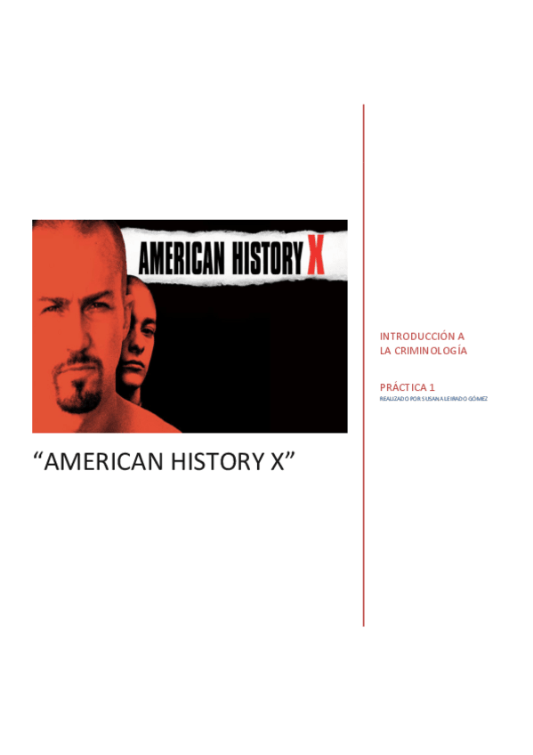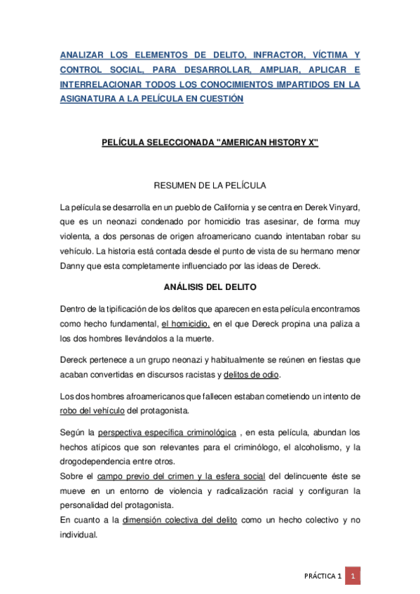 ANALIZAR LOS ELEMENTOS DE DELITO, INFRACTOR, VÍCTIMA Y CONTROL SOCIAL, PARA DESARROLLAR, AMPLIAR, APLICAR E INTERRELACIONAR TODOS LOS CONOCIMIENTOS IMPARTIDOS EN LA ASIGNATURA A LA PELÍCULA EN CUESTIÓN PELÍCULA SELECCIONADA "AMERICAN HISTORY X"