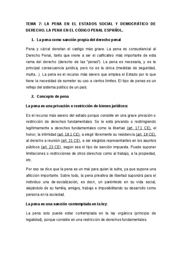 Apuntes - Tema 7 - La pena en el estado social y democrático de Derecho.docx
