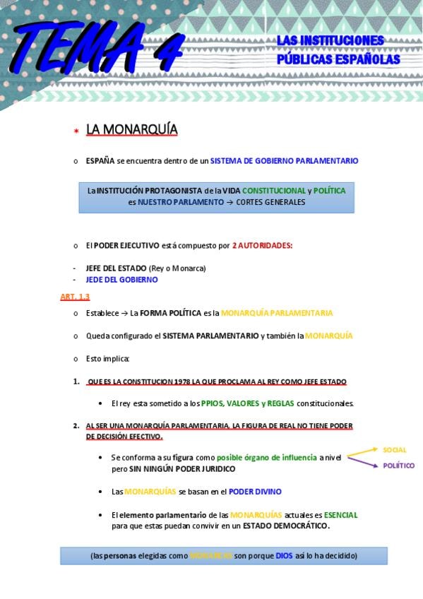 Tema 4. Engloba La Corona, las CG, el Gobierno, la Adm Pública, el Poder Judicial, y el TC, erno,