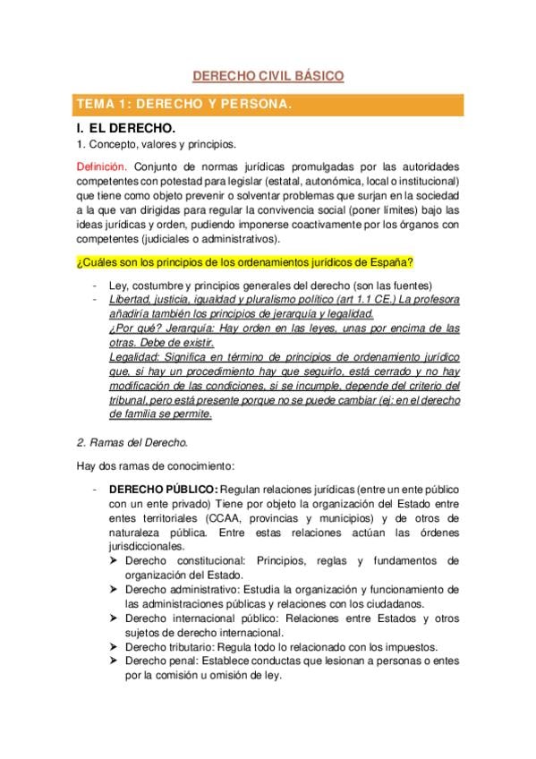 Derecho civil resumen tema 1 (Derecho y persona) - introducción al derecho