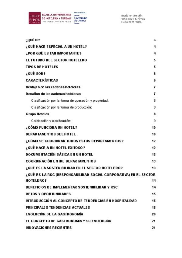 Este documento incluye los departamentos de un hotel, tipos de hoteles, sostenibilidad y RSC, innovaciones y ventajas y desventajas de las cadenas hoteleras