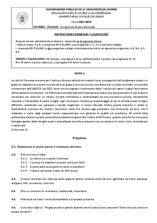 Exámenes Italiano EvAU Madrid 2022