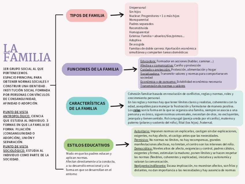En este esquema encontramos la función educativa de la familia (tipos de familia, funciones de la familia, características de la familia como son las reglas y las normas y los roles) y los estilos educativos, que es el modo en el que los padres educan a s