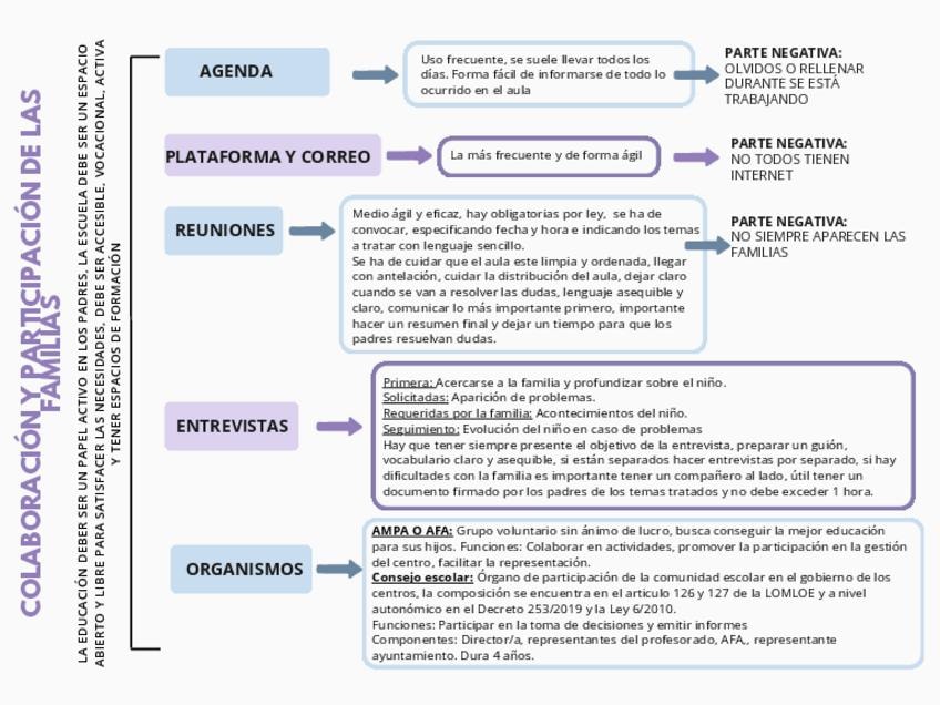 En este esquema encontramos la colaboración y participación de las familias en la acción educativa del centro, concretamente se habla de la comunicación entre escuela y familia y los organismos de participación en los centros