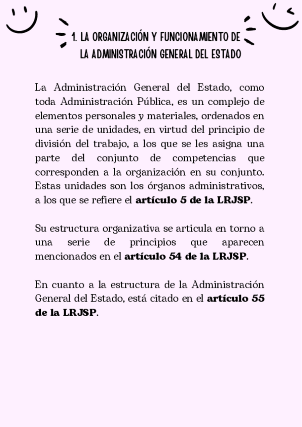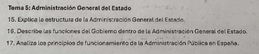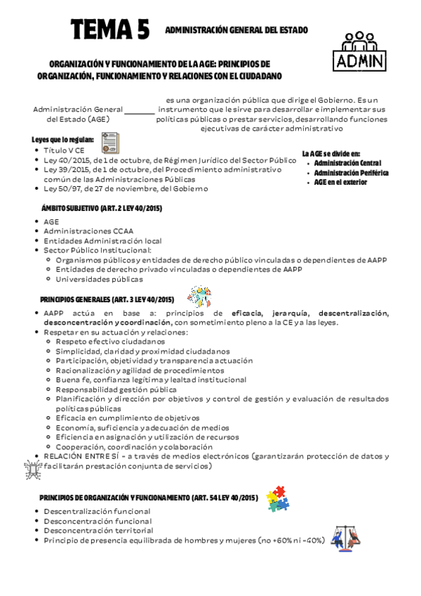 Puntos de los esquemas pertenecientes al tema 5 de la preparación a la oposición a Escala Básica de Policía Nacional: -La organización y funcionamiento de la Administración -General del Estado: Principios de organización, funcionamiento y relaciones con