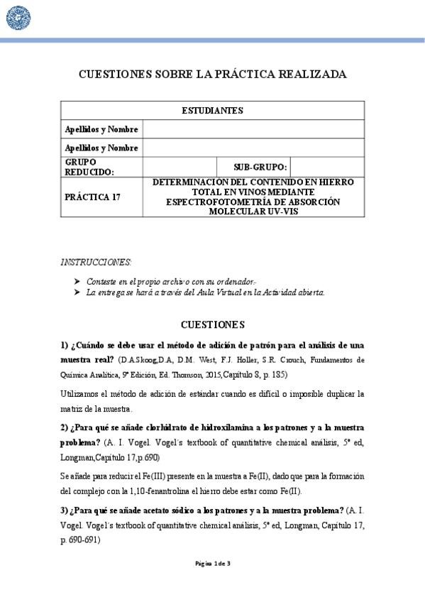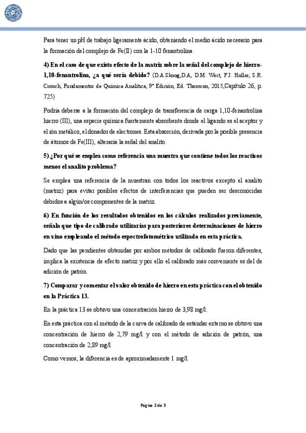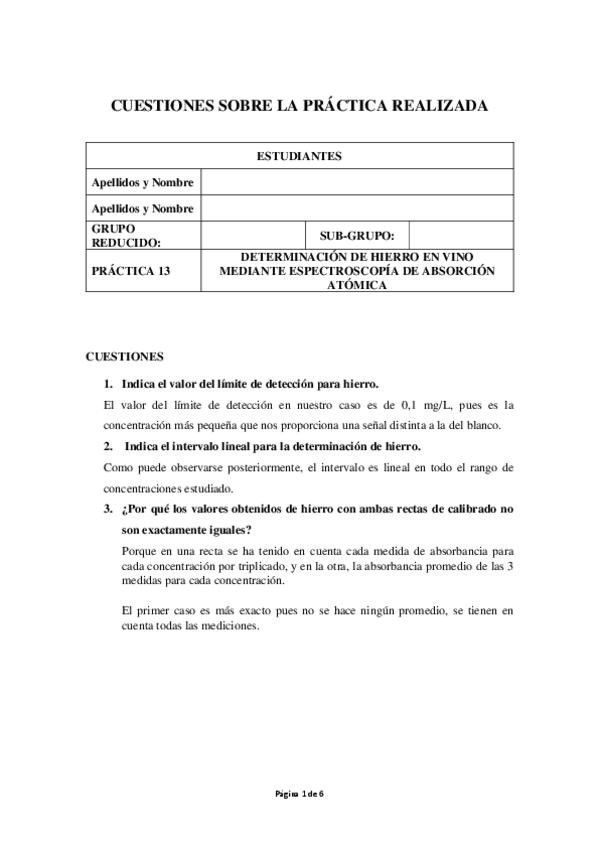 He publicado las respuestas de las preguntas de la práctica 13 del Laboratorio de Química Analítica I del 3ºcurso de Química: Práctica 13: Determinación de hierro en vino mediante espectroscopía de absorción atómica.