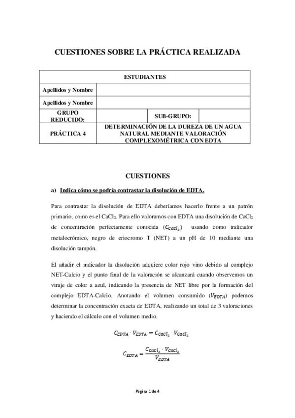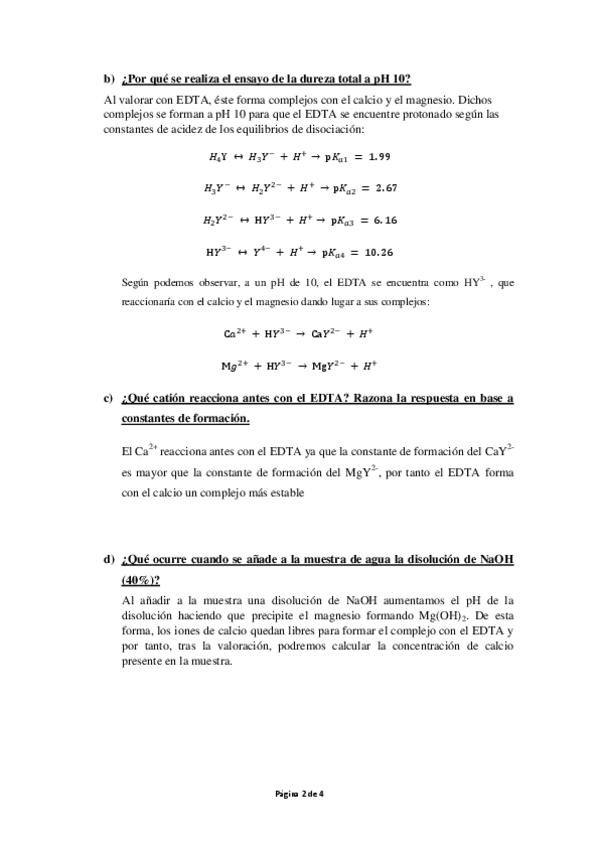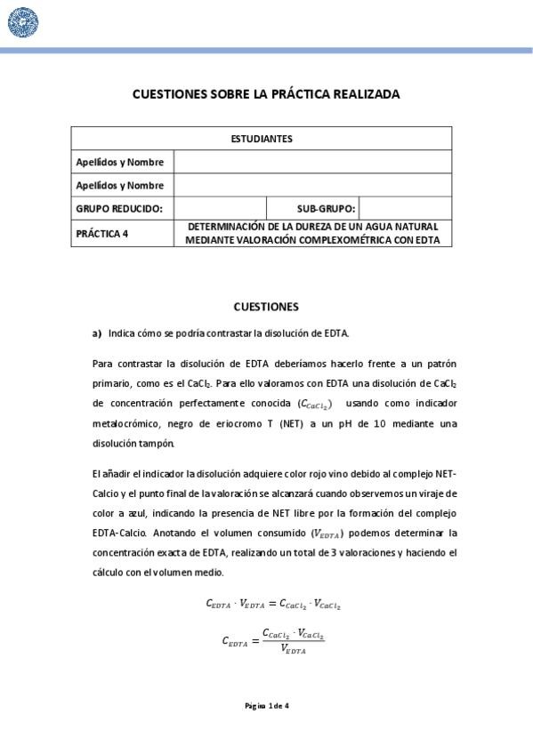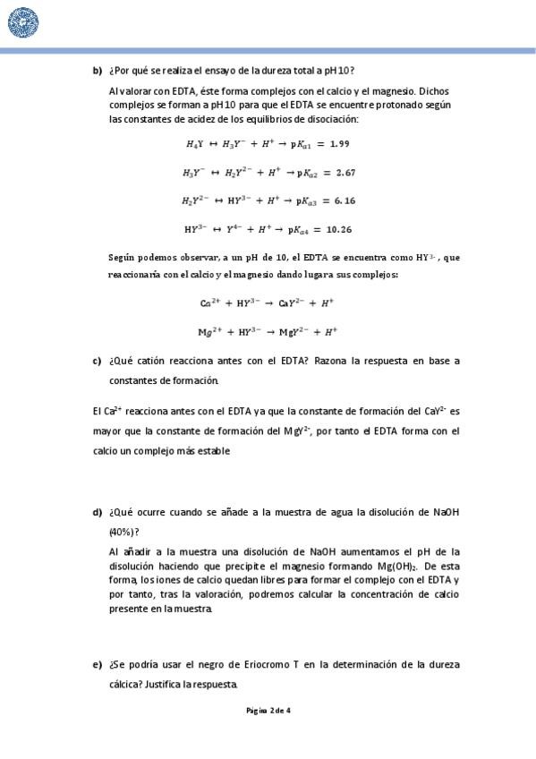 He publicado las respuestas de las preguntas de la práctica 4 del Laboratorio de Química Analítica I del 3ºcurso de Química: Práctica 4: Determinación de la dureza de un agua natural mediante valoración complexométrica con EDTA.