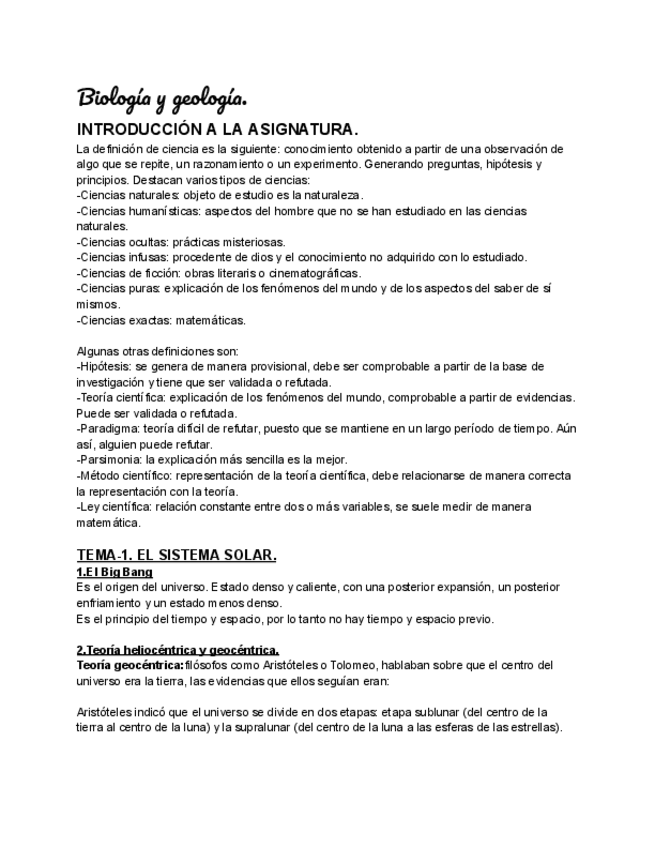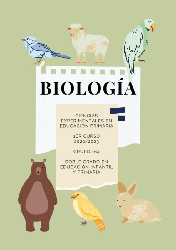 Apuntes de la primera parte (Biología y Geología) de la asignatura de Las Ciencias Experimentales en la Educación Primaria. Asignatura perteneciente al primer cuatrimestre del primer curso del Doble grado de Educación Infantil y Primaria. Específicamente,