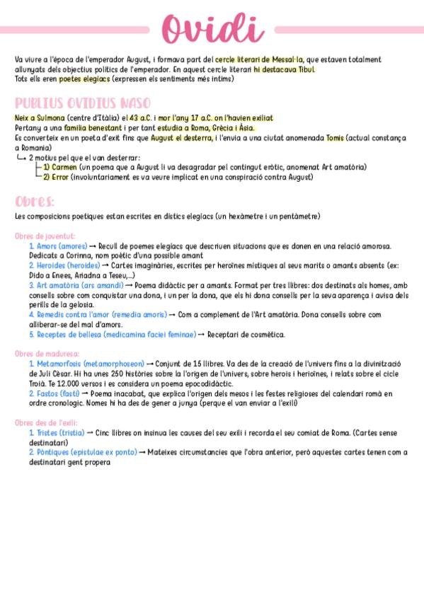 Resum de la vida de l'autor Ovidi i de les seves obres en diferents etapes vitals.