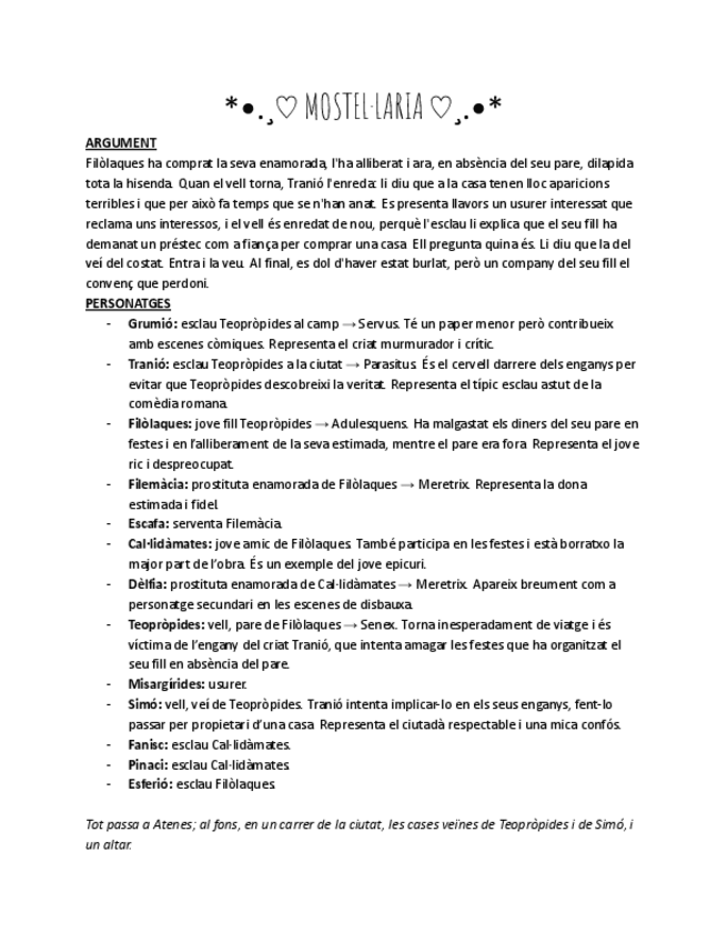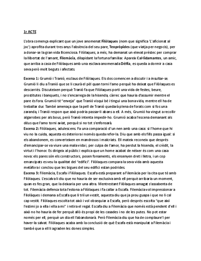 Apunts de la Mostellaria de Plaute: el teatre de Plaute, personatges i resum per actes i escenes