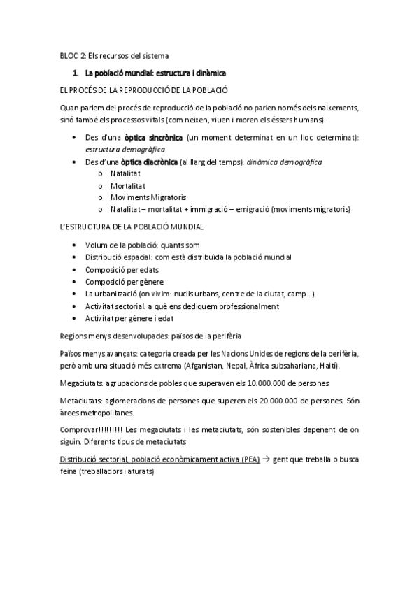 Tema 4: La població mundial: estructura i dinàmica Tema 5: L’economia dels recursos naturals i dels models energètics Tema 6: L’economia agricola i l’alimentació mundial Tema 7: Crisi ecològica i sostenibilitat mediambental