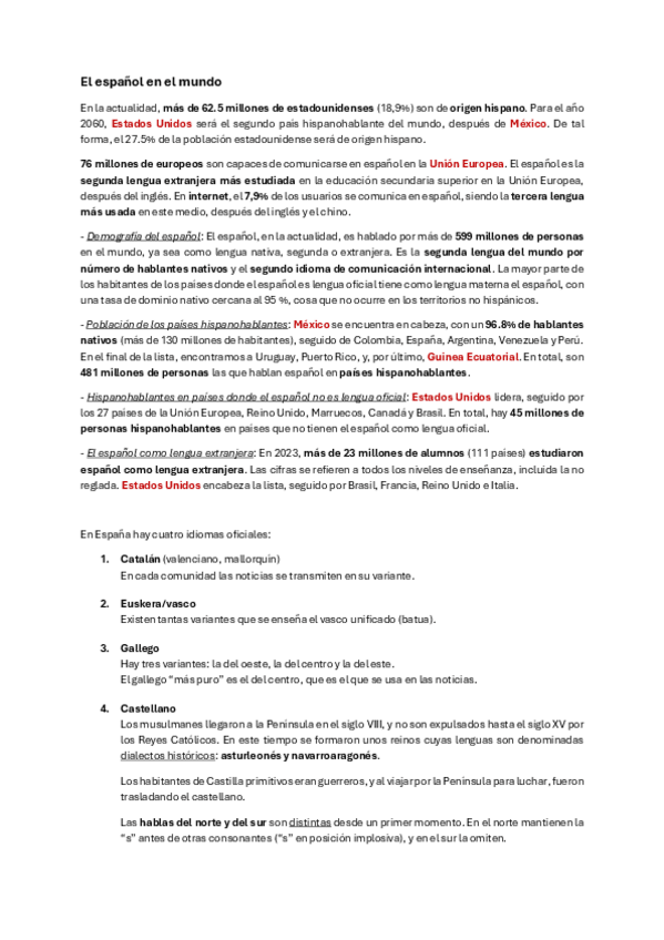 Apuntes de teoría de Lengua del "El Español en el Mundo" (2024-2025) (Recomiendo leer el resto de los apuntes de lengua de mi perfil porque se complementan) Profesora: Amalia Pedrero