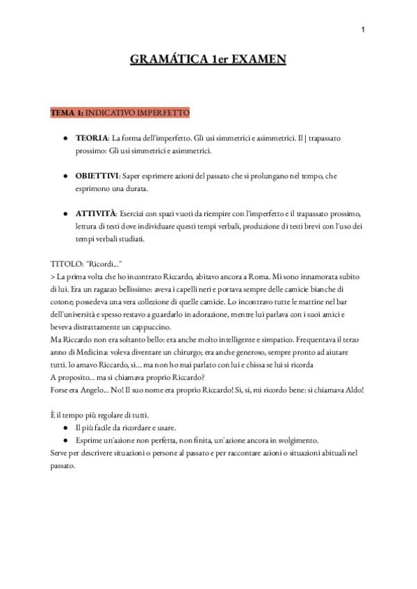 Apuntes italiano 2do cuatrimestre, 1er test. Temas 1-5 (INDICATIVO IMPERFETTO, L'USO DELL'INDICATIVO, DELL'IMPERFETTO E DEL PASSATO PROSSIMO, I PRONOMI PERSONALI IN FUNZIONE DI COMPLEMENTO, I PRONOMI COMBINATI, I PRONOMI RELATIVI)