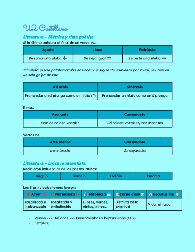 Resumen de la unidad. Contiene: Rima y métrica poética, literatura renacentista (Garcilaso de la Vega, Fray Luis de León y San Juan de la Cruz), las figuras literarias, las categorías gramaticales, los préstamos lingüísticos y ortografía (B,V, diptongos