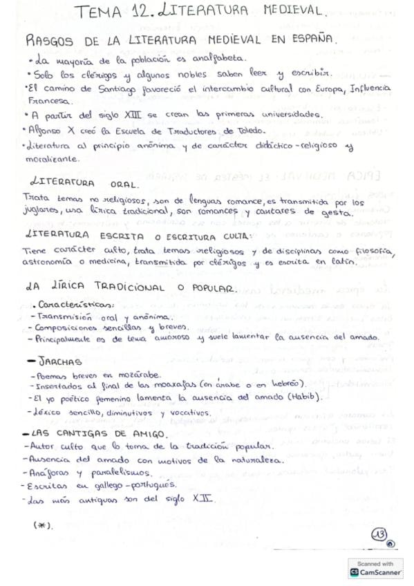 Apuntes sobre la Literatura Medieval. Incluye: poesía narrativa (mester de juglaría y clerecía + diferencias entre ellos), El Cantar de Mio Cid, Libro de Buen Amor y El Conde Lucanor. Las 3 obras incluyen: Autoría, contexto histórico y literario, argument