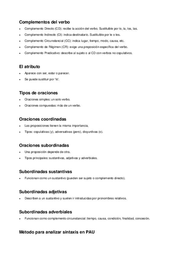 Apuntes sobre Sintaxis. Incluye: identificación de tiempos verbales (refuerzo), complementos del verbo (cuándo se usan, trucos para reconocerlos y ejemplos), valores del 'se' (cuándo se usa, actúa como cd o ci, truco para reconocerlo y ejemplos), tipos de