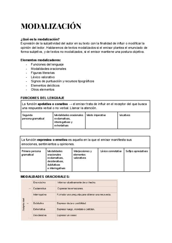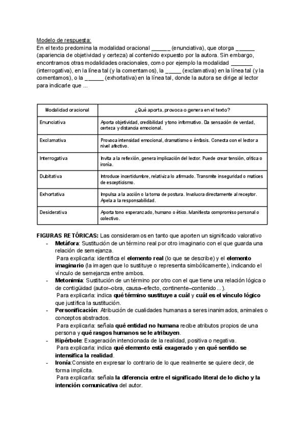 TODOS los mecanismos de Modalización en textos argumentativos + MODELO de RESPUESTA para el examen para COMPLETAR. GUIA PARA COMENTARIO DE TEXTO. Funciones del lenguaje, Modalidades oracionales, Figuras literarias, Léxico valorativo, Signos de pu