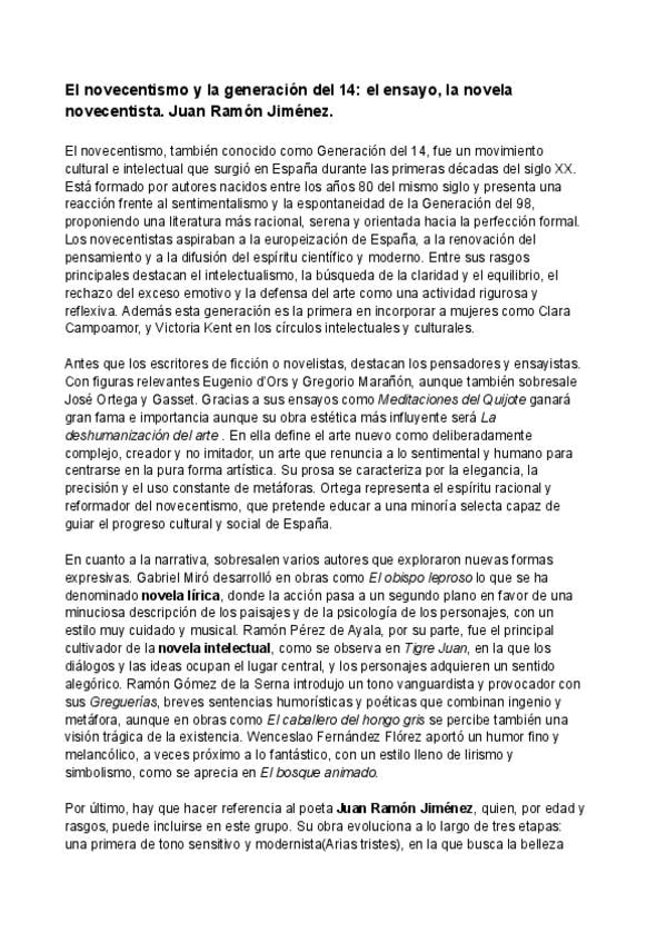 LIT 3. El novecentismo y la generación del 14: el ensayo, la novela novecentista. Juan Ramón Jiménez.